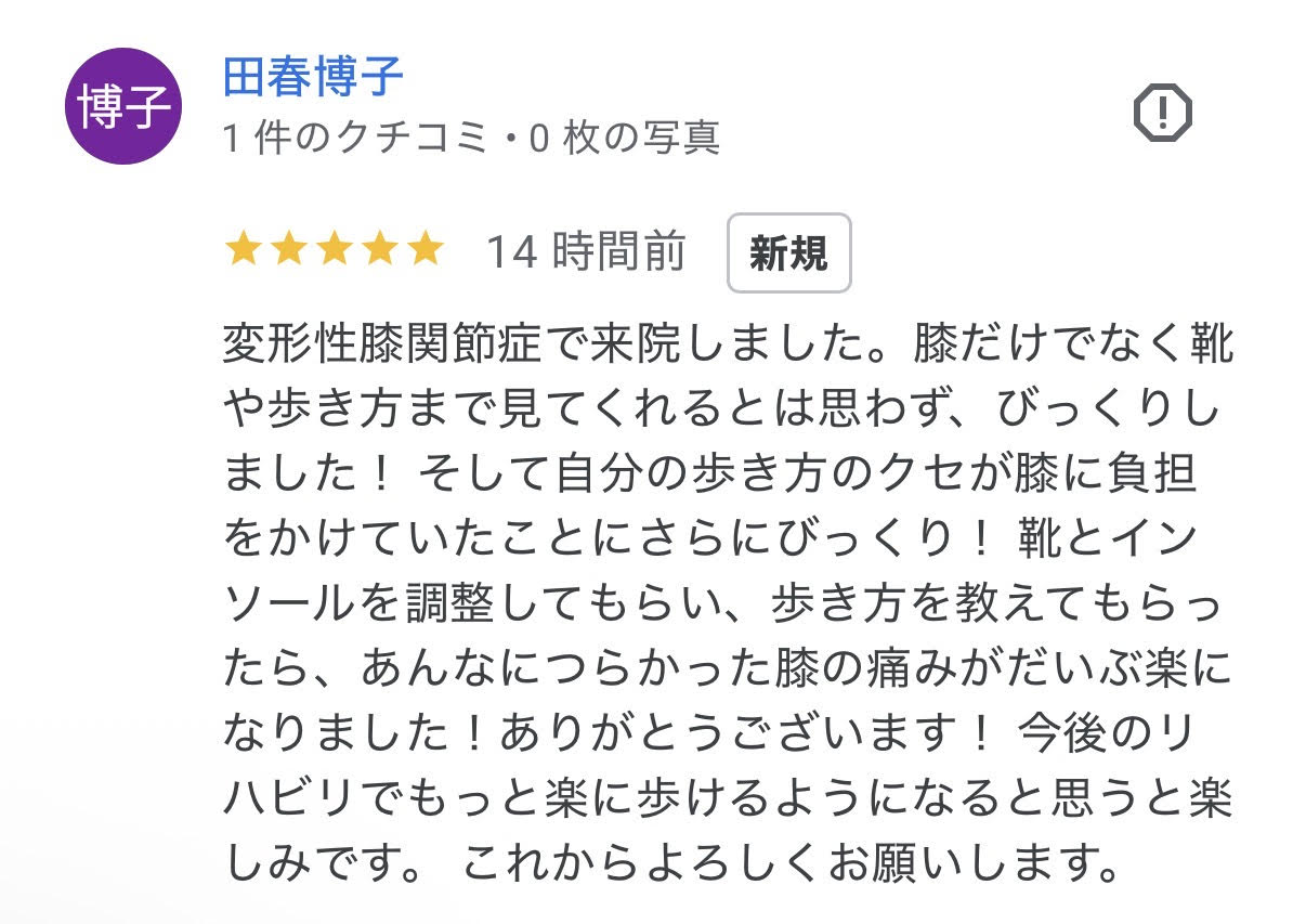 靴とインソールを調整してもらい、歩き方を教えてもらったら、あんなにつらかった膝の痛みがだいぶ楽になりました!ありがとうございます!今後のリハビリでもっと楽に歩けるようになると思うと楽しみです。これからよろしくお願いします。