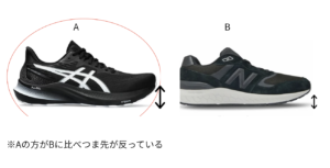 つま先部分が反り上がった靴(ロッカーソール形状)をおすすめしています。